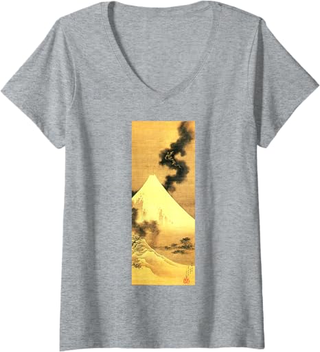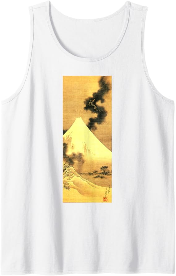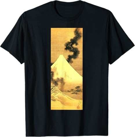 • Description: A dragon emerges from the thick black smoke circling Mount Fuji. The smoke and the dragon are one and the same, the smoke being the path through which the dragon has traveled to escape. In contrast, Mount Fuji stands pristinely white, covered in snow. Mountains in the foreground and a small puff of trees indicate the extent of the size of the mountain, which is unaffected by the escape of the dragon.